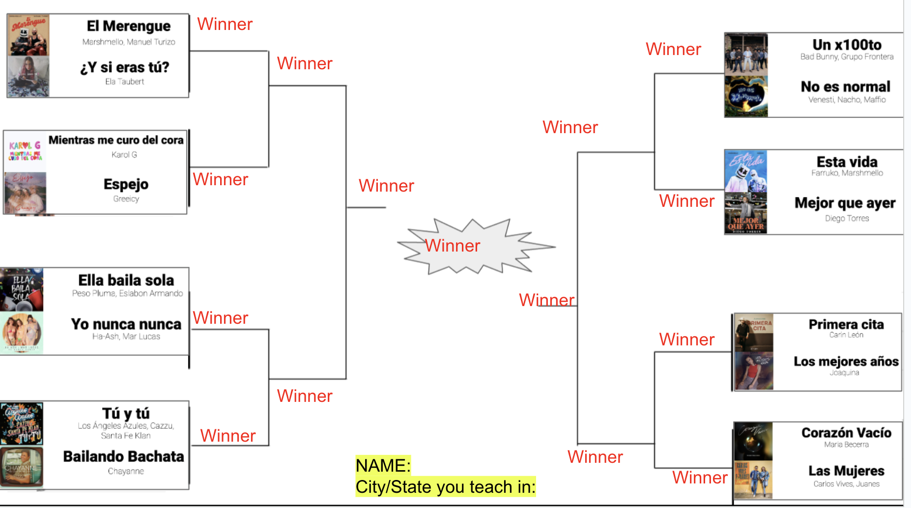 Don’t forget to take pictures of your classroom bracket display (Here’s a folder of materials you can use) and post them in the social media thread of our Facebook Group. A randomly selected post will win a prize. You can also help spread the word about this bracket by posting pictures on social media and tagging us, @SpanishPlans.
