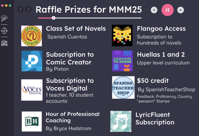 We are also running a Raffle to promote MMM25, with a plethora of dream prizes. The first entry? Submit the prediction bracket mentioned above! You could win a class set of novels from Spanish Cuentos, the entire Huellas curriculum from Somewhere to Share, plus subscriptions from Flangoo, Voces, Pixton Comics, Lyric Fluent, and more!
