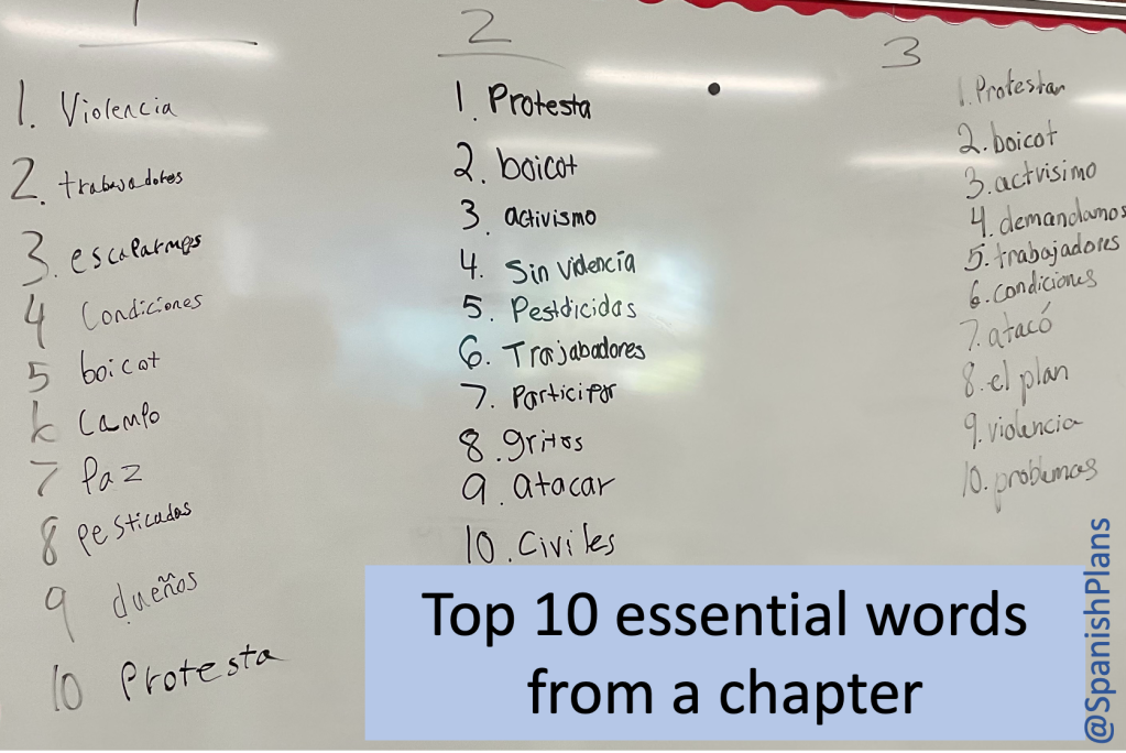 If you are reading a novel in your Spanish class, we’ve got a new activity that you may want to try. My 8th-grade class is currently reading “La Lucha” by Melisa Lopez. After reading chapter 6, I had students take out a piece of paper and review the chapter and come up with a list of 20 words they felt were most representative or most important to the events of the chapter. It had to be individual words or small phrases of 1-3 words, words that shouldn’t be separated. After they had their own list, I had them work with a partner and share lists. If a word appeared on each partners’ list, they would circle that word and see how many words they had in common. Then, I had partners join another group and as a larger group (of 4+) they had to come to a consensus on the top 10 most essential words from the chapter. The discussion about why a word was important or why one word was more important than another was great to hear. (Note: At this level, the discussion was happening in L1).