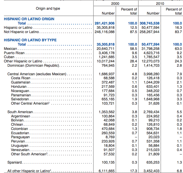 According to this information there are 50,477,594 people of Hispanic origin in the US. We can also see that 63% are Mexican, 9% Puerto Rican, 7.9% Central American, 5.5 South American, and just 1.3% Spanish.