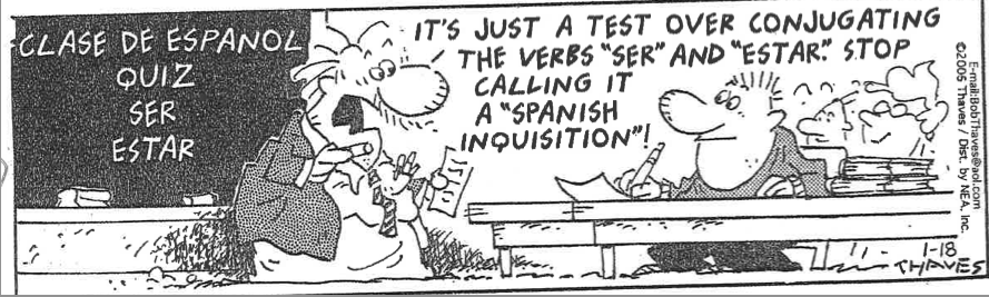 In the above comic, your students can explain that “está” is used because of the location, but then it changes to “es” because it is now starting description/characteristics.