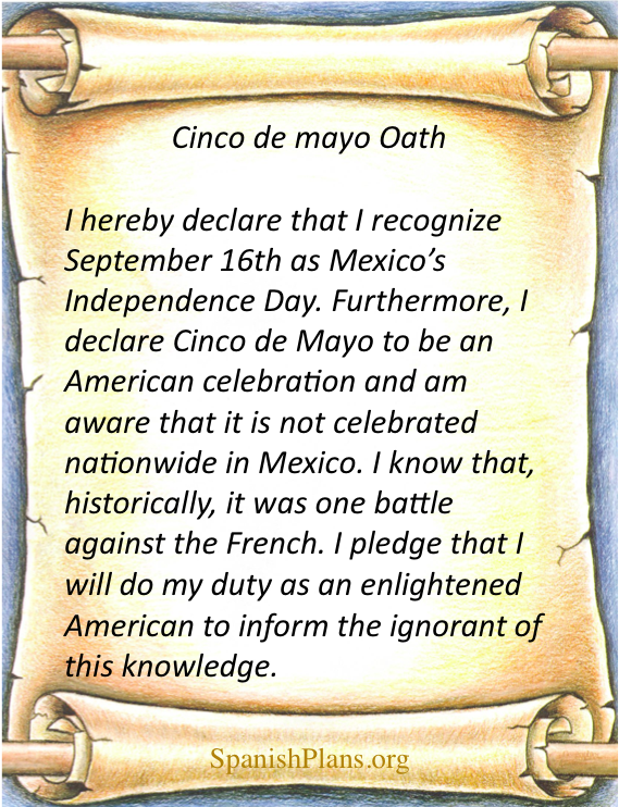 Furthermore, I declare Cinco de Mayo to be an American celebration and am aware that it is not celebrated nationwide in Mexico. I know that historically, it was one battle against the French. I pledge that I will do my duty as an enlightened American to inform the ignorant of this knowledge.