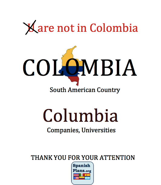 One of my biggest pet peeves is the spelling of the Colombia. In fact, I have even seen news programs get it wrong. The country of Colombia does not have a “U” in it. Not even in the “English version”. In Spanish AND English the country has two O’s. No U’s. This is one fact my students know not to mess up.