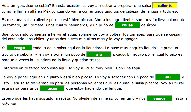 I was looking for your cloze activity on the recipe salsa habenera. I went to wordchamp.com, but I am not sure which website it is. Can you be more specific, Porfa? Is this something you are sharing for free or we can purchase it? I am really interested in the activity as we are starting our unit on food. Muchas gracias