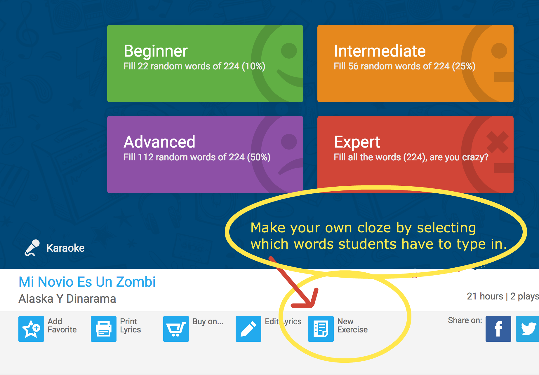 Take the song Mi Novio Es un Zombi on Lyrics Training to have students do an online close activity. On this link, teachers can