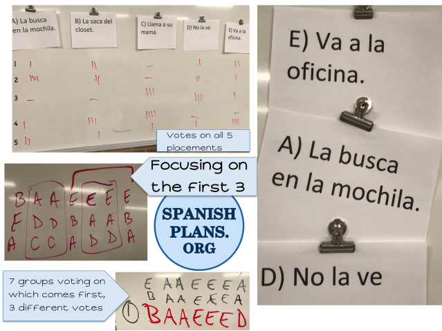 I might try to justify why a group put it in a certain order by trying to clarify something. “Oh, va a la oficina porque su mamá trabaja en la oficina. Pero no ve a su mamá. No la ve.” I make sure to state that “¡Es possible!“, never saying one is “correct”.