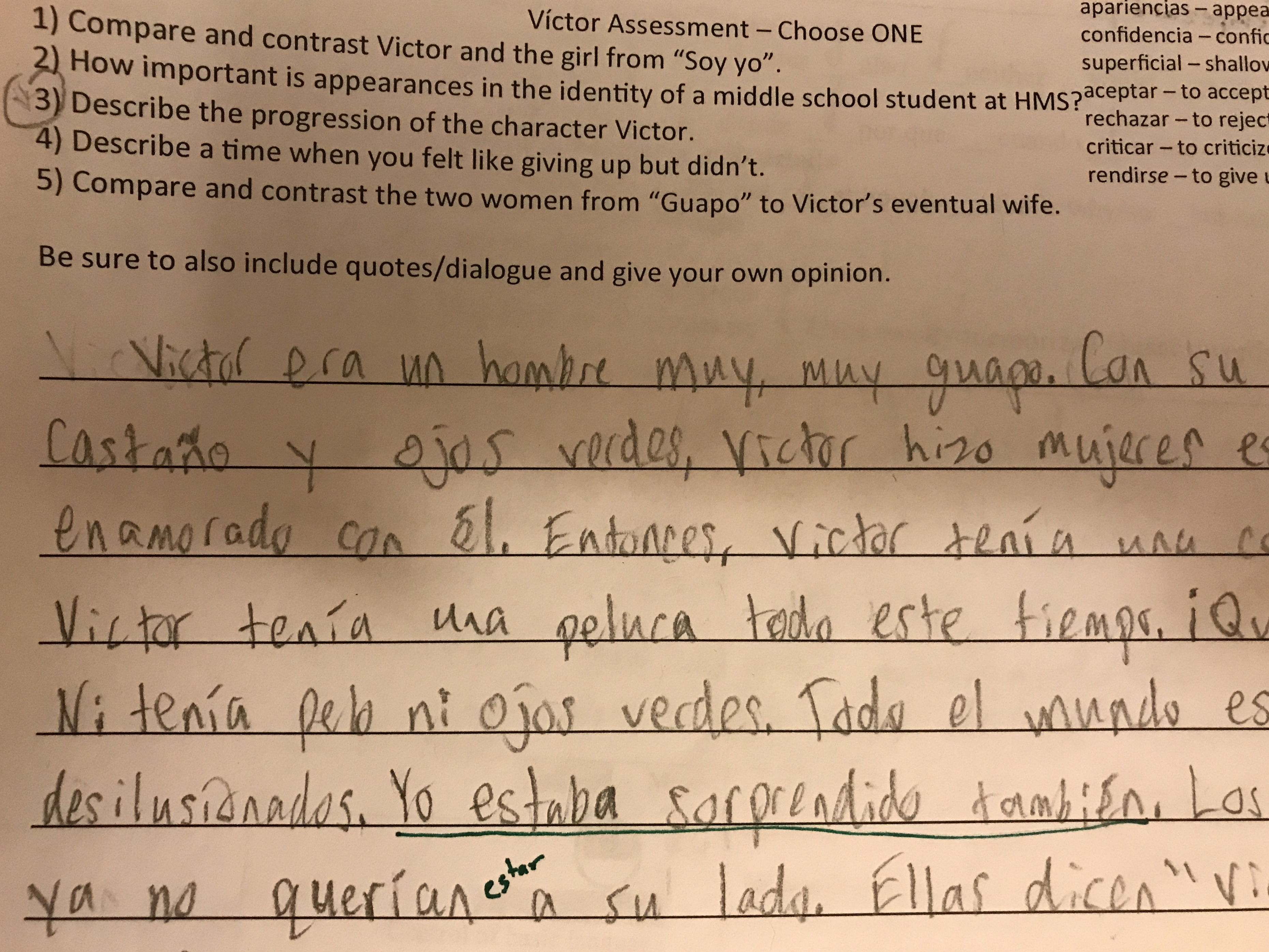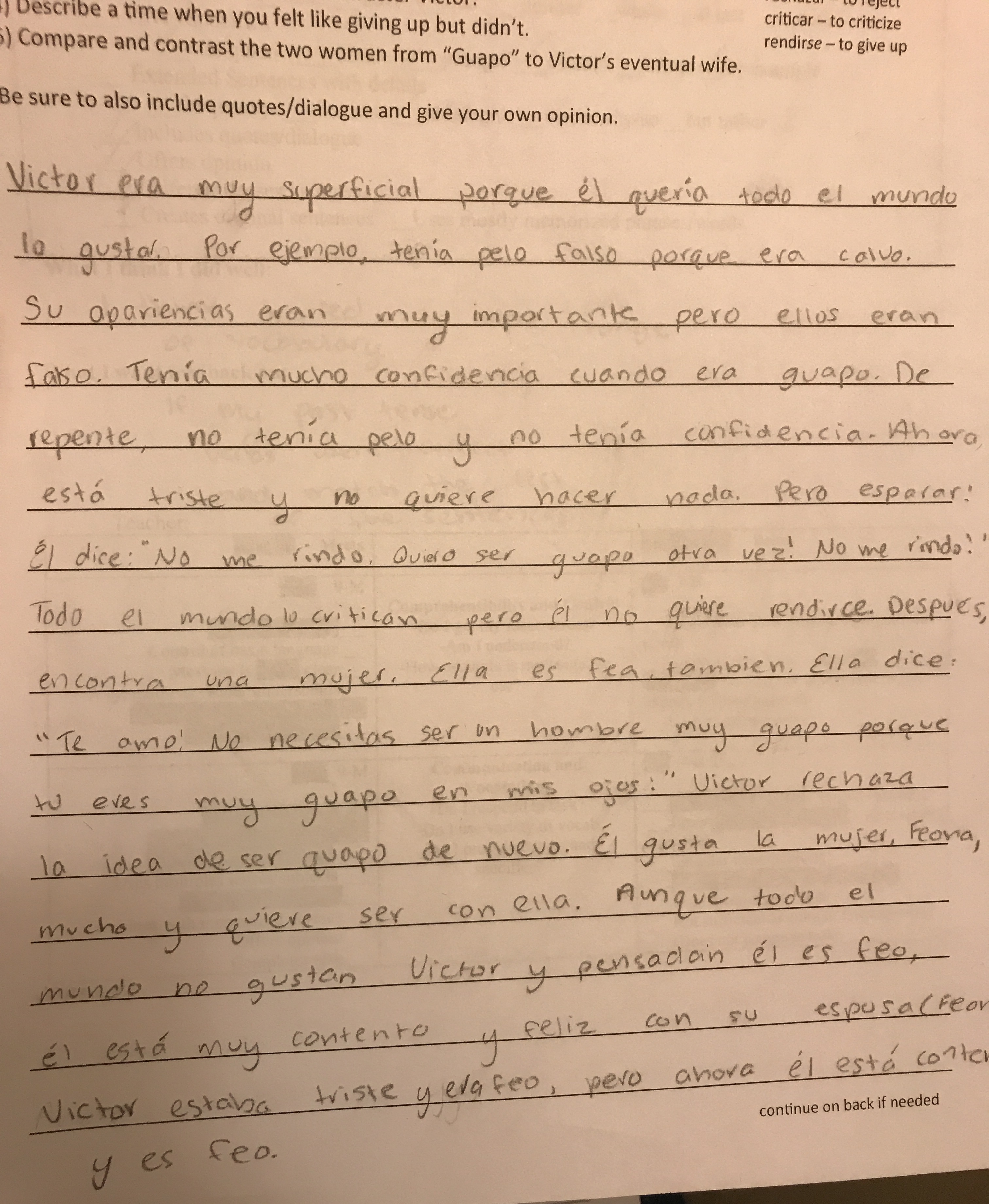 This past week we finally watched the 3rd video of Senor Wooly’s epic Victor Trilogy (Guapo, La Confesión de Victor, Feo). I also needed to get a summative-type assessment grade in the gradebook, so I decided to try something new and see what my students could do. After sharing the results on twitter, I’ve had several requests for the rubric, which I will share below.I didn’t want my students to just re-tell the stories and I also wanted to challenge them to Level Up their Language. So I made my prompt simple yet challenging by asking them to analyze. This was either going to be super difficult for my students, or they were going to impress me. Luckily, they knocked it out of the ballpark by showing me what they could do with their own language.