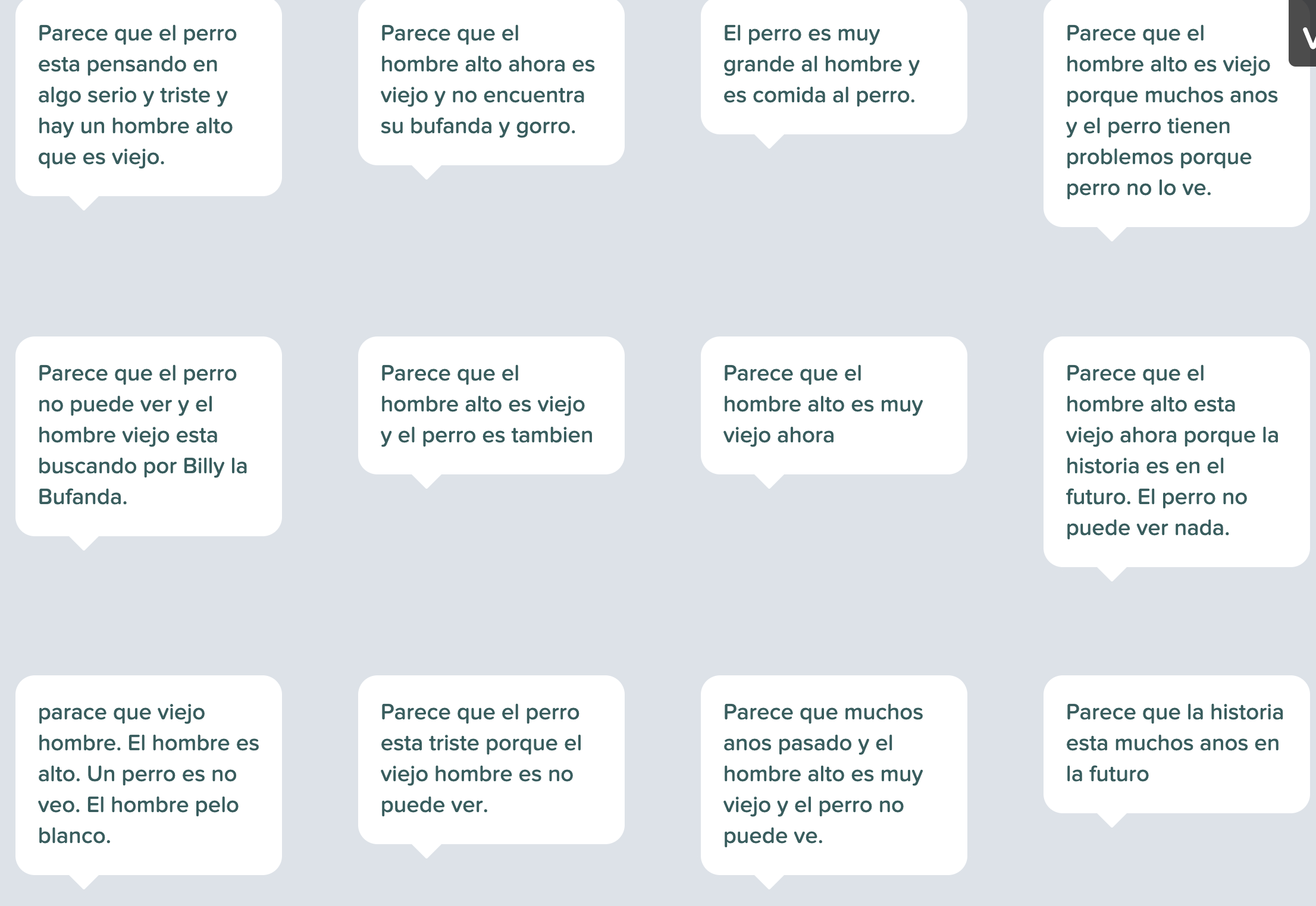 As students saw more and more images, a story started to form in their head. In this case, students began predicting that Gorro was stealing Las Botas from Billy… some students were shocked that Gorro would betray his best friend.  Each new scene seemed to play into this prediction. Going through about 10-12 slides and writing their responses took up 35-40 minutes.