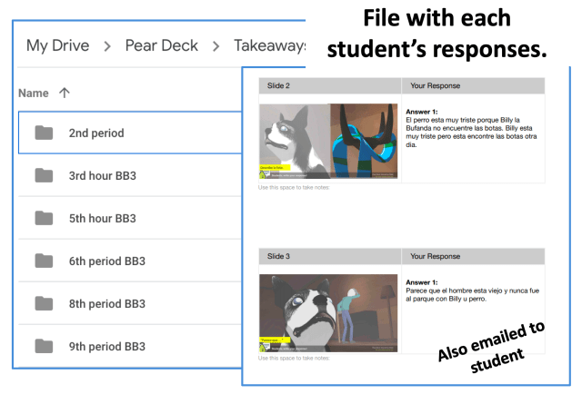 When you end a session and publish takeaways, responses from each student will appear in your google drive in the Pear Deck folder and students will receive an email with all of their responses.