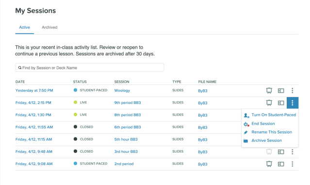 When you close a session you can save it. For example, I save a separate session for each class. This is where I can turn on student-paced so students can work through the entire presentation at their own speed or end the session so students can no longer submit responses.