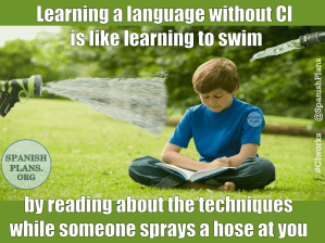 In the past we’ve used the analogy of acquiring languages as being like learning to swim. Is it best to jump in the deep end of the pool with no support? Is it practical to learn the techniques and physics of swimming before you get into the pool? Can a spray bottle simulate the same experience as being in water?