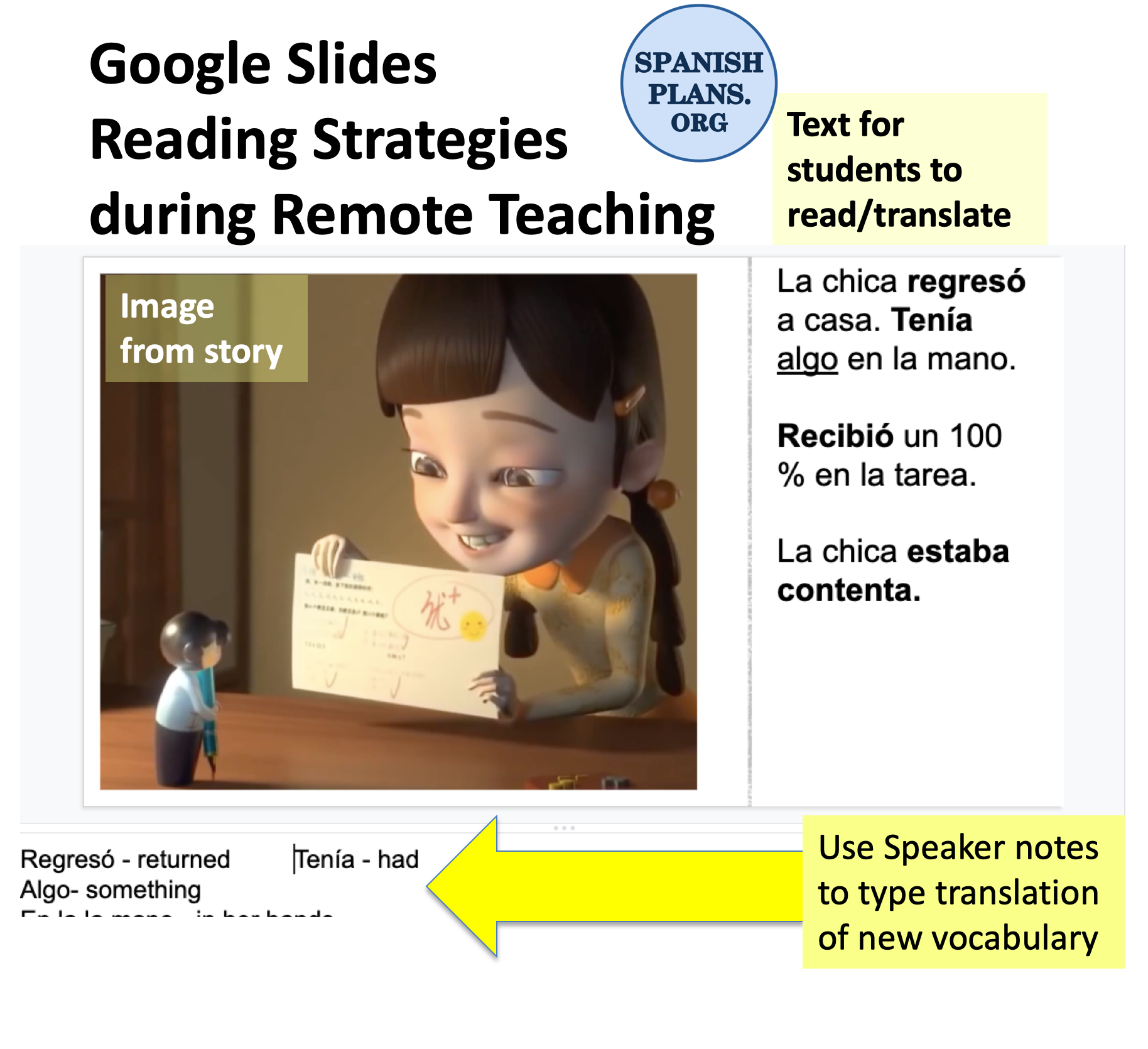 5) Students take turns reading an entire slide in English. They work in groups so that they can help each other out. You can also choose to have the student sharing the screen put it in in present mode so the whole group can’t see the speaker notes and then this person is responsible for helping their classmates because they can see the translation, or if they don’t use present mode, then everyone can see the speaker notes.